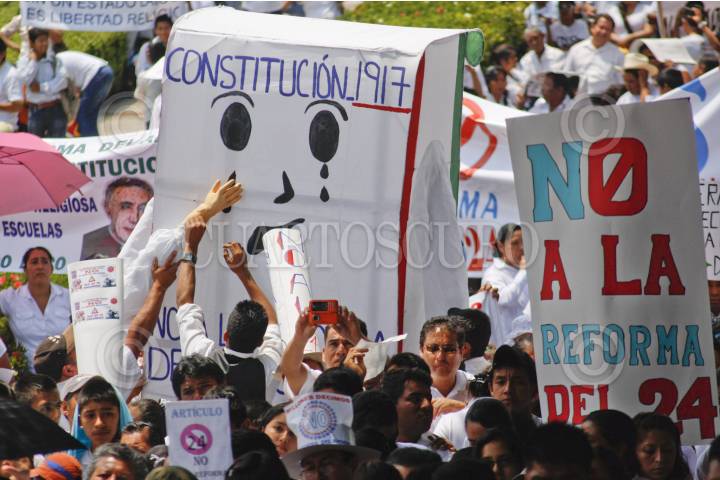 CIUDAD JUÁREZ, CHIHUAHUA, 01FEBRERO2012.- Una gran columna de religiosos de distintas denominaciones, recorrió la mañana de este miércoles calles céntricas de Ciudad Juárez para protestar en contra de la reforma del Artículo 24 constitucional -aprobada por los diputados el 15 de diciembre del año pasado- que concede privilegios a la Iglesia Católica y resta laicidad al Estado mexicano Con grandes mantas al frente con textos como: "Benito Juárez no puede resucitar la lucha ahora es nuestra / Reforma no / Soylaico.org", los varios miles de manifestantes recorrieron la principal avenida 16 de Septiembre para concluir en un mitin en el Monumento a Benito Juárez. FOTO: NACHO RUíZ/CUARTOSCURO.COM