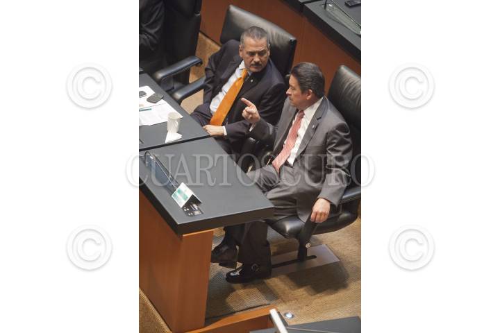 MÉXICO, D.F., 28MARZO2012.- Manlio Fabio Beltrones, senador del PRI, platica con Carlos Navarrete, del PRD, durante la sesión ordinaria en ese recinto. Ahí se aprobó la reforma al primer párrafo del artículo 24 de la Constitución para establecer la libertad de convicciones éticas, en medio de un debate que se prolongó por más de tres horas y en el que participaron más de diez senadores. FOTO: JUAN PABLO ZAMORA /CUARTOSCURO.COM