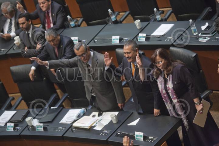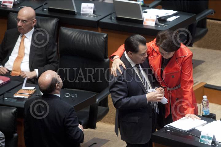 MÉXICO, D.F., 28MARZO2012.-Los senadores del PRI Melquiades Morales, Fernando Baeza, Manlio Fabio Beltrones, y Yeidckol Polevnsky, del PRD, durante la sesión ordinaria en ese recinto. Ahí se aprobó la reforma al primer párrafo del artículo 24 de la Constitución para establecer la libertad de convicciones éticas, en medio de un debate que se prolongó por más de tres horas y en el que participaron más de diez senadores. FOTO: JUAN PABLO ZAMORA /CUARTOSCURO.COM