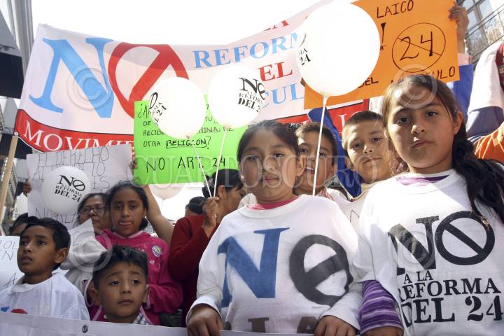 MÉXICO, D.F., 14MARZO2012.- Integrantes de organizaciones laicas realizaron una manifestación afuera de la nueva sede del Senado, donde las comisiones de Puntos Constitucionales y de Estudios Legislativos analizan las reformas a los artículos 24 y 40 de la Constitución. Al interior de la sede senatorial, las comisiones iniciaron el análisis de los cambios al artículo 40 de la Carta Magna, que reafirma el carácter laico del Estado mexicano, para tratar de aprobar el dictamen respectivo. FOTO: MOISÉS PABLO /CUARTOSCURO.COM