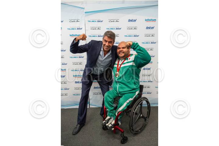 CIUDAD DE MÉXICO, 22OCTUBRE2024.- El medallista paralímpico José de Jesús Castillo se toma una foro con Arturo Elías Ayub durante la ceremonia en la cual Fundación Telmex Telcel les entregó apoyos económicos a los medallistas de los Juegos Olímpicos y Paralímpicos de París 2024. FOTO: MOISÉS PABLO/CUARTOSCURO.COM