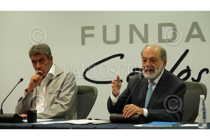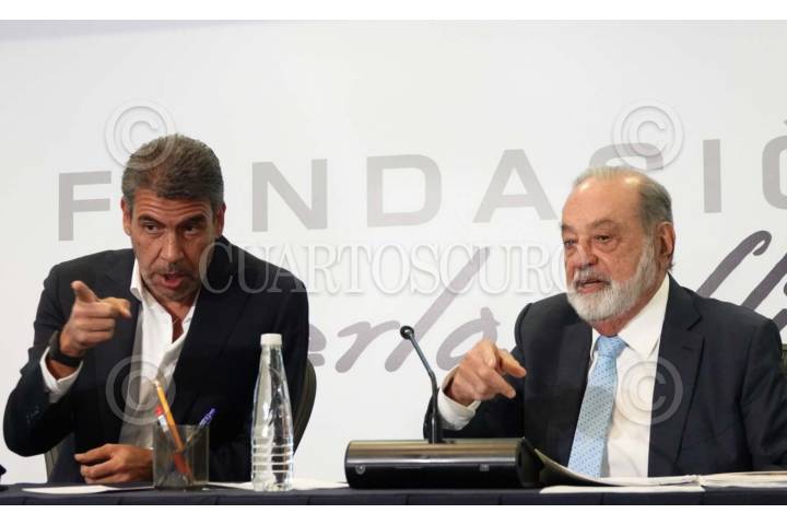CIUDAD DE MÉXICO, 12FEBRERO2024.- El empresario Arturo Elías Ayub y el ingeniero Carlos Slim ofrecieron una conferencia de prensa en las instalaciones de Inbursa Grupo Financiero. FOTO: GRACIELA LOPEZ /CUARTOSCURO.COM