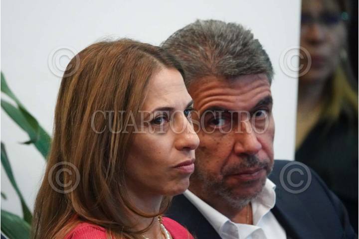 CIUDAD DE MÉXICO, 10FEBRERO2025.- Johana Slim Domit, hija del ingeniero Carlos Slim y su esposo Arturo Elías Ayub durante la conferencia de prensa en Grupo Financiero Inbursa FOTO: GRACIELA LÓPEZ/CUARTOSCURO.COM