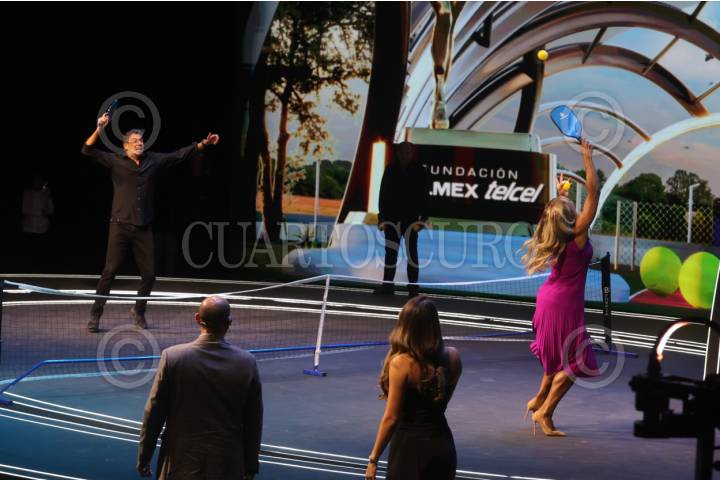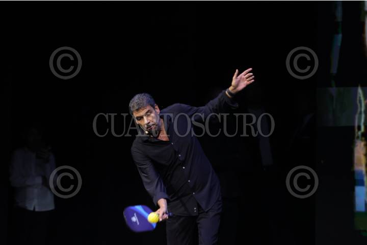 CIUDAD DE MÉXICO, 05SEPTIEMBRE2025. Arturo Elías Ayub disputa un punto de tenis a Serena Williams durante el cierre del evento de Fundación Telmex Telcel “México Siglo XXI #MSXXI”, el encuentro anual de Fundación con sus becarios, en el Auditorio Nacional. FOTO: EDGAR NEGRETE LIRA/CUARTOSCURO.COM