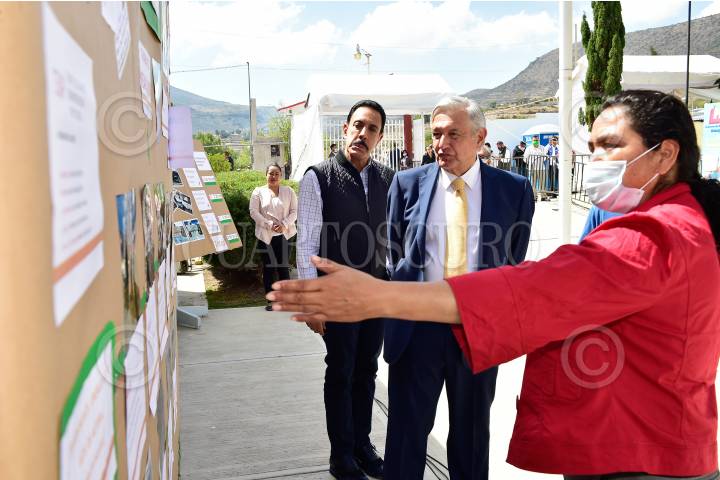 Omar Fayad, gobernador de Hidalgo, y Andrés Manuel López Obrador, presidente de México, durante el recorrido por la escuela primaria Emiliano Zapata en San Agust´in Tlaxiaca, Hidalgo.