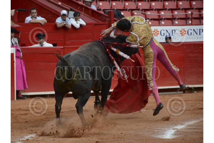 AGUASCALIENTES, AGUASCALIENTES. 26ABRIL2017.- El torero Arturo Macías, horas después de ser intervenido quirúrgicamente de una cornada que recibió mientras tentaba en la ganadería de Manolo Espinosa, cortó una oreja del sobrero de regalo de Julián Hamdan, durante la quinta corrida de la Feria de San Marcos. FOTO: GABINO ACEVEDO / CUARTOSCURO.COM