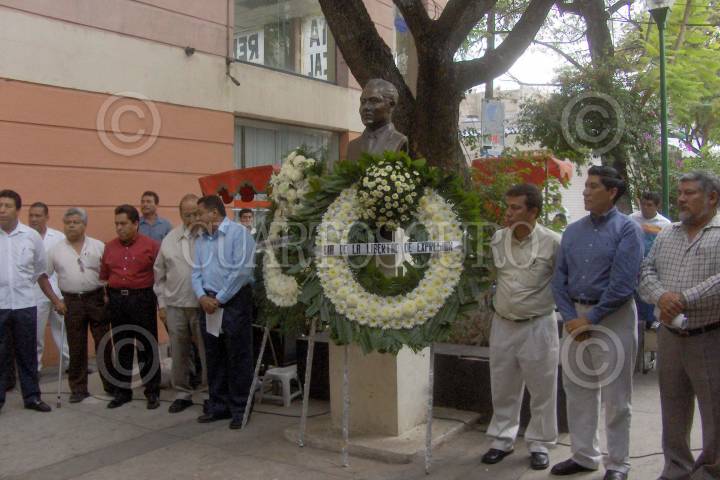 CHILPANCINGO, GUERRERO 07JUNIO2006.- Aspecto general de la guardia de honor y ofrenda floral, llevada a cabo en la plaza de la Libertad de Expresión, por parte de integrantes de la delegacion XVII del SNRP encabezados por el dirigente de dicha organizacion Pedro Arzeta García y el alcalde de Chilpancingo Mario Moreno Arcos, al celebrarse el Dia de la Libertad de Expresión. FOTO: Oscar Alvarado/CUARTOSCURO.COM