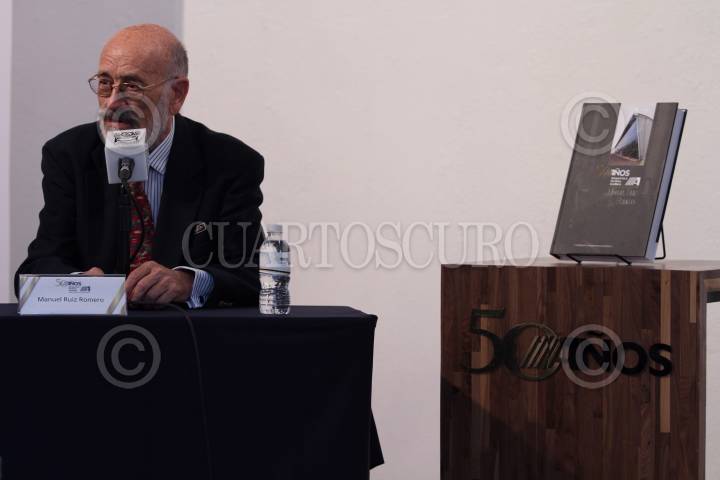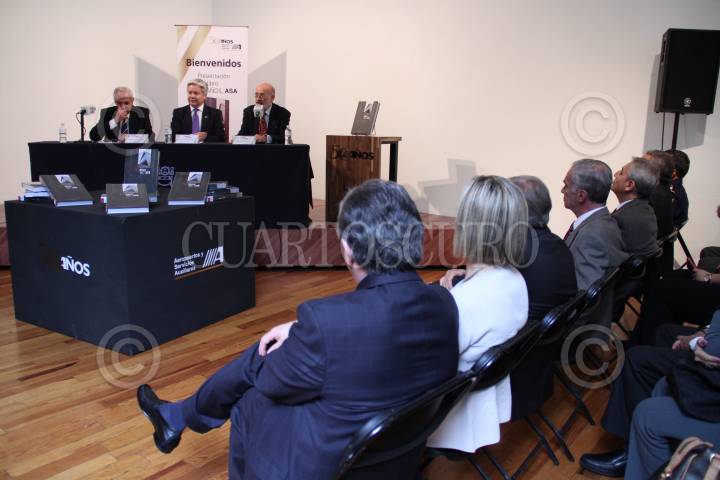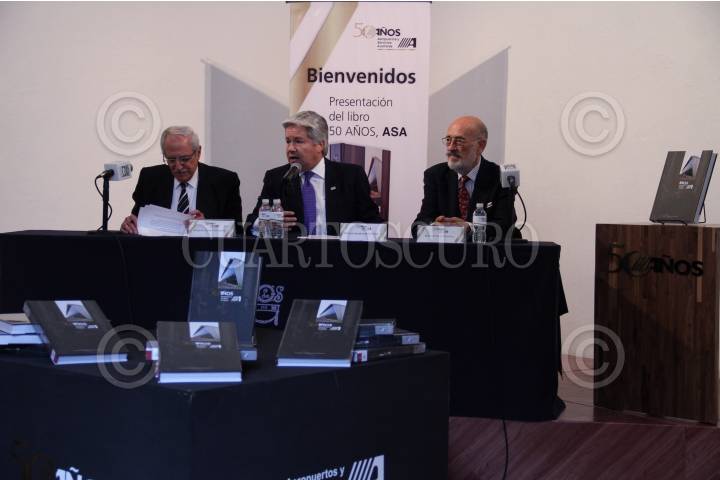 MÉXICO, D.F., 30JUNIO2015.- El escritor y periodista Manuel Ruiz Romero, presentó el libro "50 años de ASA", en conmemoración del 50 aniversario de ASA (aeropuertos y servicios auxiliares). Lo acompañaron en el presidio, Roberto Kobeh González en representación de ASA y Alfonso Sarabia de la Garza en representación de la secretaria de comunicaciones y transportes. FOTO: ISABEL MATEOS /CUARTOSCURO.COM