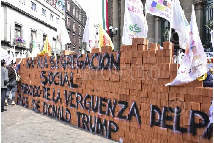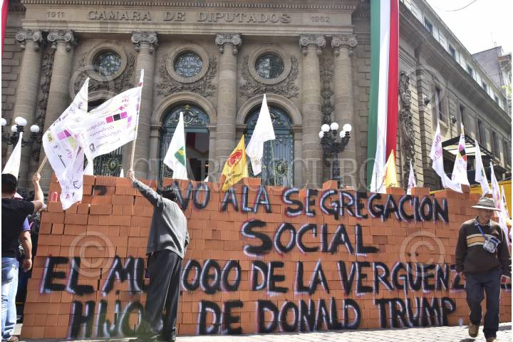 CIUDAD DE MÉXICO, 22SEPTIEMBRE2016.- Integrantes de la Asamblea de Barrios colocaron un muro de ladrillo en las escalinatas de la Asamblea Legislativa del DF, para protestar por falta de vivienda popular, ahí colocaron una pinta en donde denunciaron que son segregados de los programas sociales de vivienda en la capital, hacieno referencia al candidato presidencial estadunidense Donald Trump. FOTO: ARMANDO MONROY /CUARTOSCURO.COM