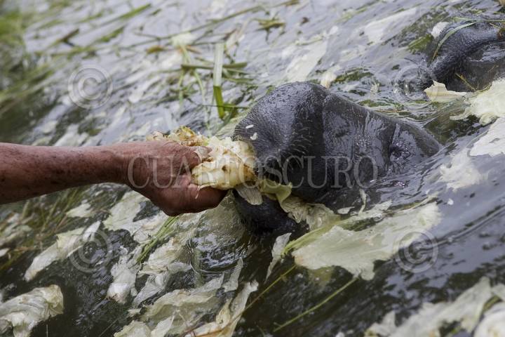 JONUTA, TABASCO, 25AGOSTO2011.- Don Valentín Ascencio de 70 años de edad mejor conocido como "El abuelo manatí" tiene un don de comunicación que mantiene con seis manatíes que ha creado desde hace mas de una década; les silba, les habla, los mima, alimenta y hasta los medicamenta cuando enferman. La única problemática es que ninguna autoridad ambientalista quiere hacerse cargo de estos mamiferos acuáticos, ya que teme que cuando él fallezca no haya quien se encargue de estos animales en peligro de extinción; Manatí proviene de la lengua indígena Caribe Con Tetas y su nombre científico es Trichechus manatus, del griego tri (tres) y Chechus (uñas), esta especie marina no poseen ningún enemigo natural sin embargo esta en vías de desaparición por su extinción debido a factores que amenazan la especie como su cacería para el consumo de su carne, contaminación de las aguas y redes de pesca desechadas en el agua que le producen la muerte al ahogarse. FOTO: MARCO POLO GUZMÁN HERNÁNDEZ/CUARTOSCURO.COM