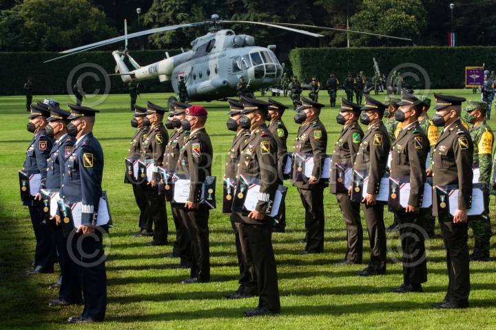 Miembros del Estado Mayor de la SEDENA recibieron reconocimientos y ascensos durante la conmemoración al Día del Estado Mayor, en Campo Marte.
