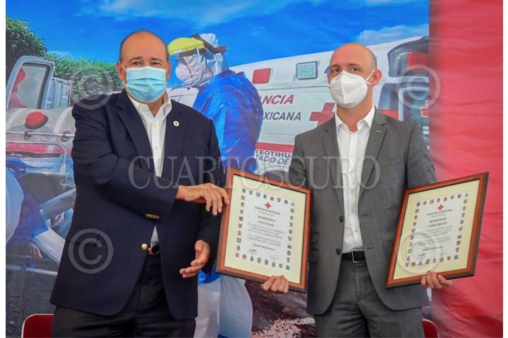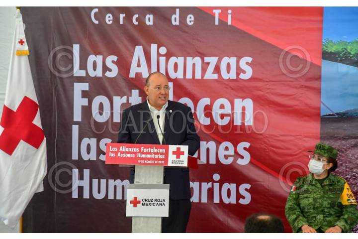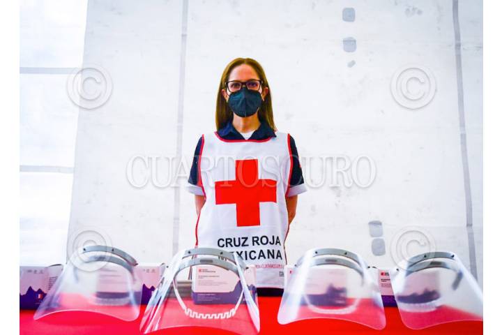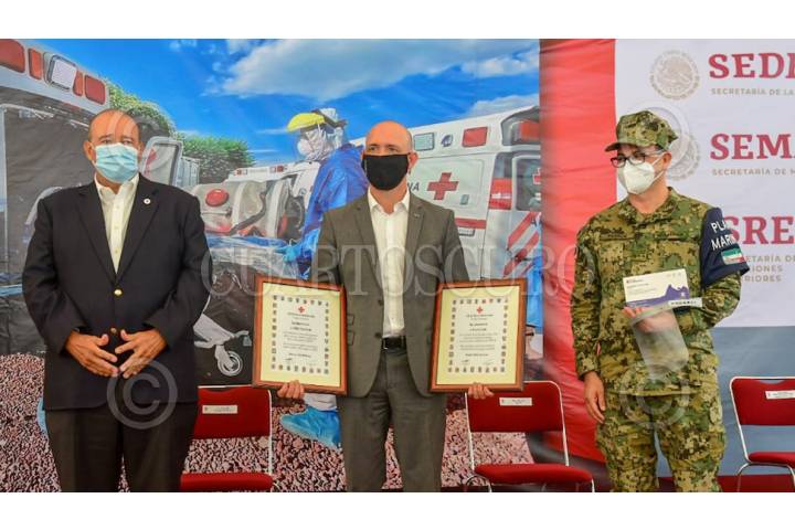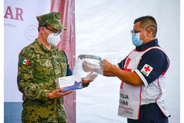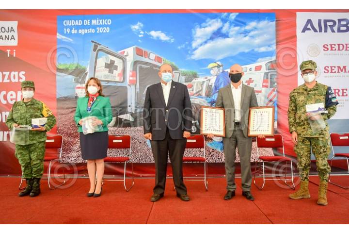 La Cruz Roja en manos de su presidente, Fernando Suinaga Cárdenas, mascarillas de protección a integrantes del ejercito Mexicano. El evento tuvo lugar en la oficinas de la Cruz Roja de Polanco.