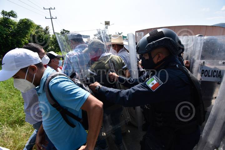 Granaderos empujando a manifestantes, tratando de colocarlos fuera de la Autopista del Sol