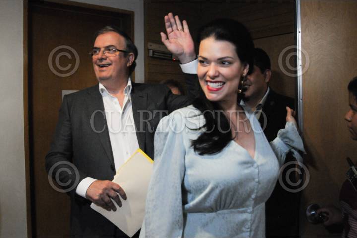 CIUDAD DE MÉXICO, 22FEBRERO2024. - Marcelo Ebrard y Rosalinda Bueso salen del lugar luego de que Ebrard se registrara como nuevo senador de Morena. FOTO: DANIEL AUGUSTO /CUARTOSCURO.COM