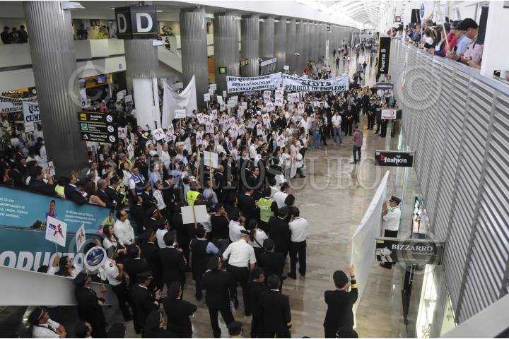MÉXICO, D.F., 22SEPTIEMBRE2015.- Integrantes del Frente por la Defensa de la Aviación Nacional conformados por la Asociación Sindical de Pilotos Aviadores de México (ASPA), Sindicato de Sobrecargos de Aviación (ASSA) y el Sindicato de Trabajadores de Tierra, marcharon de la Terminal 2 a la Terminal 1 del Aeropuerto Internacional de la Ciudad de México en rechazo al convenio en materia de aviación entre México y Estados Unidos. FOTO: SAÚL LÓPEZ /CUARTOSCURO.COM