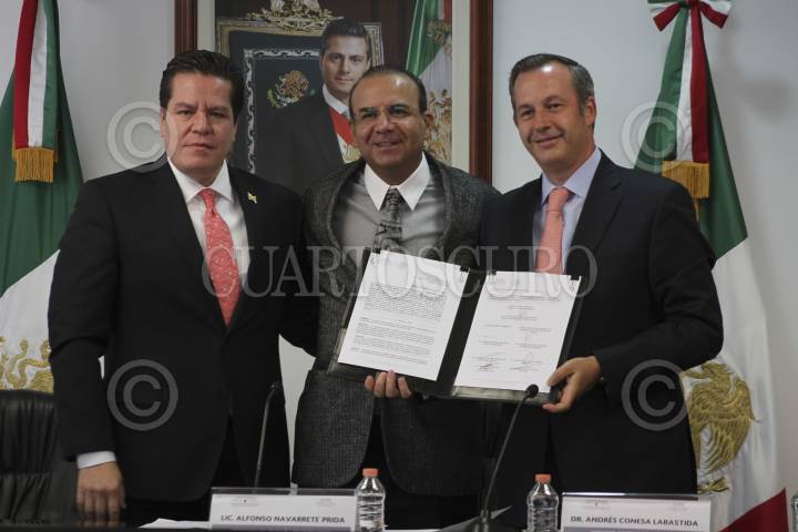 CIUDAD DE MÉXICO, 23MAYO2017.- Alfonso Navarrete Prida, Secretario del Trabajo y Prevención Social (STPS), atestiguó el convenio entre la Asociación Sindical de Sobrecargos y Aviación de México (ASSA) y Aeroméxico, donde firmaron Ricardo del Valle, secretario de ASSA de México y Andrés Conesa Labastida, Director General de Aeromexico en la sala de Secretarios de esta Institución. FOTO: ANTONIO CRUZ /CUARTOSCURO.COM