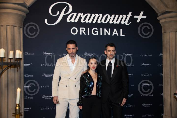 CIUDAD DE MÉXICO, 05DICIEMBRE2023.- Miguel Ángel Silvestre, Assira Abbate y Luis Gerardo Méndez a su paso por la alfombra azul de la serie original de Paramount + "Los Enviados", en la capilla gotica del Centro Cultural Helénico. FOTO: EDGAR NEGRETE LIRA/CUARTOSCURO.COM