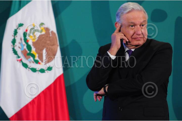 Andrés Manuel López Obrador, presidente de México, escucha a la exposición de Elizabeth Vilchis durante la conferencia mañanera.