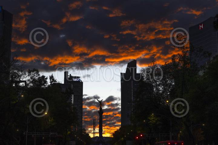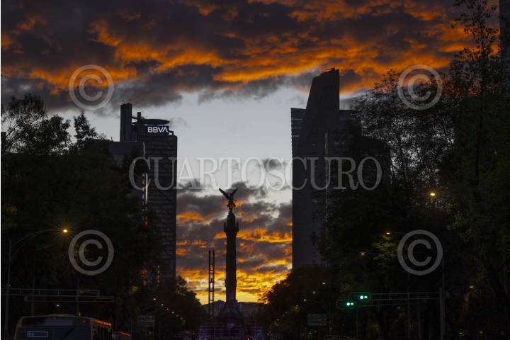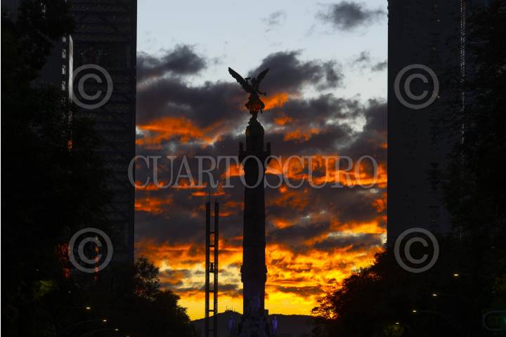CIUDAD DE MÉXICO, 13ENERO2025.- Por segundo día consecutivo los capitalinos pudieron admirar un rojizo atardecer en la capital, en la imagen el Ángel de la Independencia es destacado en su silueta. FOTO: MOISÉS PABLO/CUARTOSCURO.COM