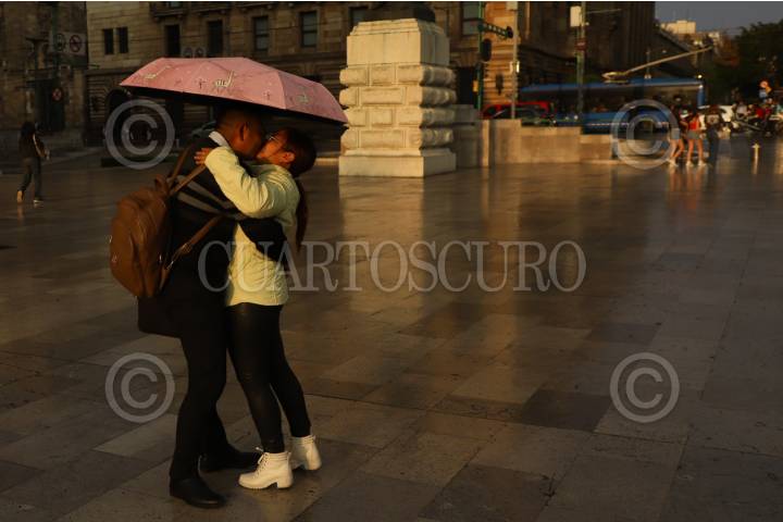 CIUDAD DE MÉXICO, 22ABRIL2025.- Una pareja se besa mientras cae la tarde y la lluvia en el centro de la capital del país. FOTO: DANIEL AUGUSTO/ CUARTOSCURO.COM