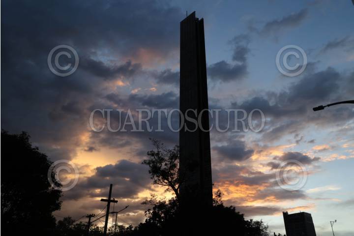 CIUDAD DE MÉXICO, 04AGOSTO2025.- El atardecer perfila silueta de la Estela de Luz, o también conocida como la suavicrema por la gente, este monumento fue realizado para conmemorar el bicentenario de la Independencia Mexicana y Centenario de la Revolución, en el período del ex Presidente, Felipe Calderón, y está ubicado en el acceso principal del Bosque de Chapultepec. FOTO: MOISÉS PABLO/CUARTOSCURO.COM
