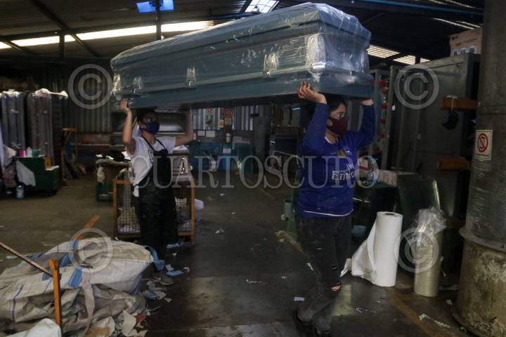 Trabajadores de la Fabrica Ataúdes Sainz, trabajan a marchas forzadas en la fabricación de ataúdes y urnas, ya que la demanda del producto es grande a causa de la pandemia sanitaria de COVID-19.