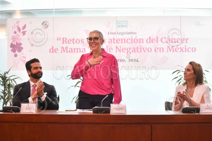 CIUDAD DE MÉXICO, 13MARZO2024.- Kenji López, presidente de la Fundación Warriors de México A.C.; Alejandra Noemí Reynoso, senadora del PAN y vicepresidenta de la mesa directiva, y Tatiana Elizondo, paciente testimonio de cáncer de mama triple negativo, durante el foro legislativo “Retos en la atención del cáncer de Mama triple negativo en México” realizado en las instalaciones del Senado de la República. FOTO: MARIO JASSO/CUARTOSCURO.COM