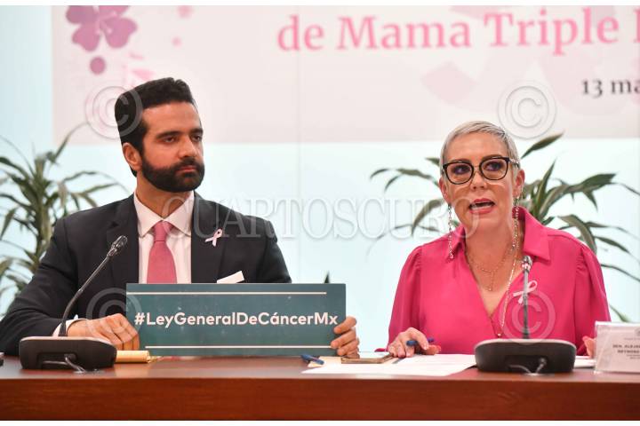 CIUDAD DE MÉXICO, 13MARZO2024.- Kenji López, presidente de la Fundación Warriors de México A.C. y Alejandra Noemí Reynoso, senadora del PAN y vicepresidenta de la mesa directiva, durante el foro legislativo “Retos en la atención del cáncer de Mama triple negativo en México” realizado en las instalaciones del Senado de la República. FOTO: MARIO JASSO/CUARTOSCURO.COM