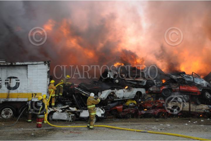 SAN SALVADOR ATENCO, ESTADO DE MÉXICO, 25ABRIL2011.- A la altura del kilómetro 24 de la carretera federal Texcoco-Lechería, en el municipio de San Salvador Atenco; un corralón de vehículos chatarra fue consumido por el fuego, al momento se reporta un bombero herido. La Agencia de Seguridad Estatal (ASE) informó que el incendio se registra en un lote de aproximadamente 3 mil metros cuadrados, ubicado en la población La Pastoría. Señalaron que se desconoce el origen de la conflagración que se registra en el depósito de vehículos con razón social Grúas Romero, donde se encuentran apilados hasta nueve filas de vehículos. FOTO: CUARTOSCURO.COM