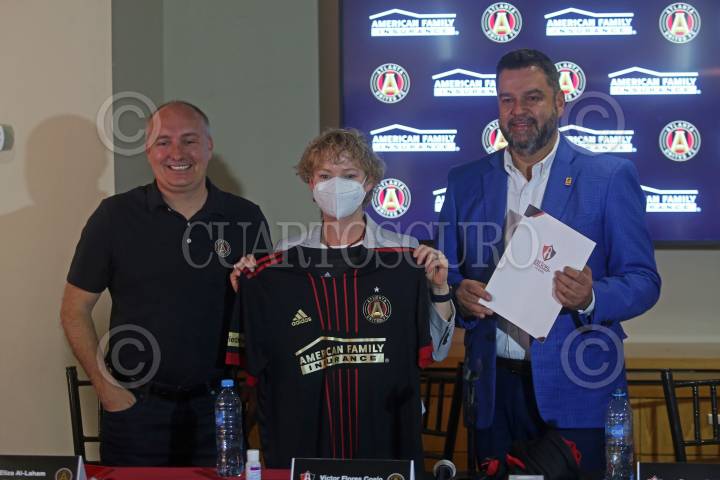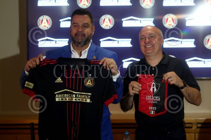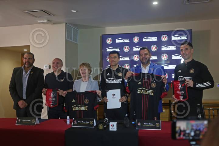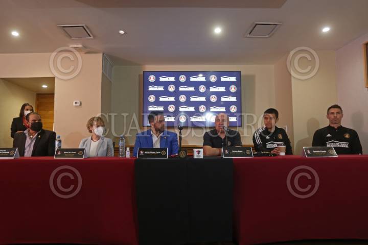 José Luis Velázquez Ladewig Viceprecidente de Atlas, Eliza Al-Laham Consul General de Estados Unidos, Víctor Flores Cosio Presidente de Atlas Colomos, Darren Eales Presidente del Atlanta United, Gonzalo Pineda Director Técnico del Atlanta United y Carlos Bocanegra Director Deportivo del Atlanta United, durante la recepción del equipo norteamericano en las instalaciones del Atlas Colomos.