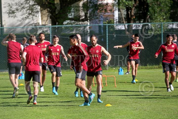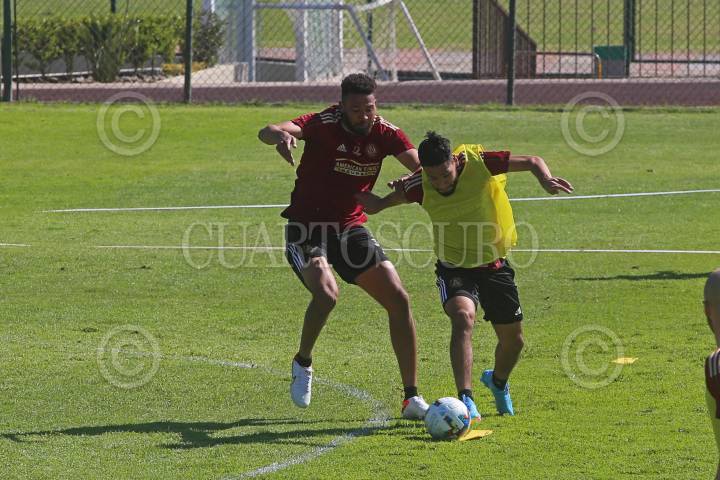 Jugadores y Cuerpo Técnico del Atlanta United de la MLS, durante su practica matutina en las instalaciones del Club Atlas Colomos.