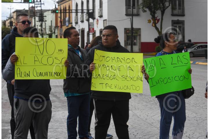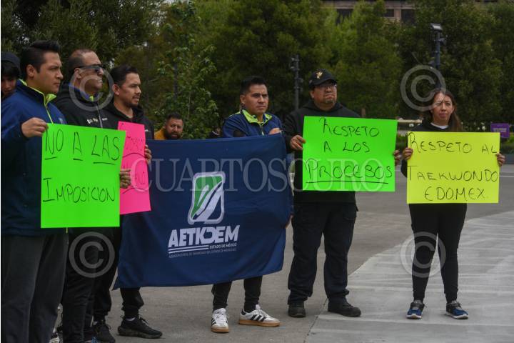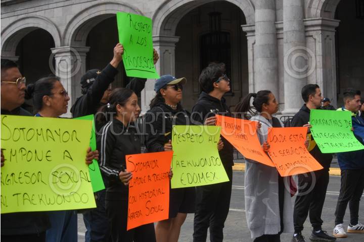 TOLUCA, ESTADO DE MÉXICO, 19JUNIO2025.- Atletas, familiares y entrenadores de la Asociación de Taekwondo del Estado de México se manifestaron en Palacio de Gobierno denunciando el retiro de apoyos por parte de la Dirección General de Cultura Física y Deporte del Edoméx, así como la falta del seguro médico para los deportistas, acoso, amenazas y diversas irregularidades por los encargados de este instituto estatal, hicieron un llamado a la Gobernadora Delfina Gómez Álvarez y al Secretario de Educación, Ciencia, Tecnología e Innovación, Miguel Ángel Hernandez Espejel, a tomar cartas en este asunto ya que se encuentran con esta situación cuando previó a su participación en la Olimpiada Nacional. FOTO: CRISANTA ESPINOSA AGUILAR /CUARTOSCURO.COM