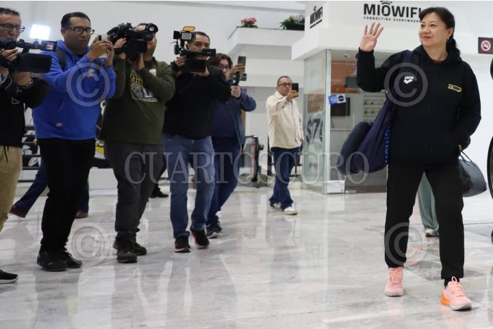 CIUDAD DE MÉXICO, 05AGOSTO2025.- La entrenadora, Ma Jin, saluda a los medios que la esperaban a ella y a Osmar Olvera luego de su participación en el Campeonato Mundial de Deportes Acuáticos. FOTO: DANIEL AUGUSTO/ CUARTOSCURO.COM
