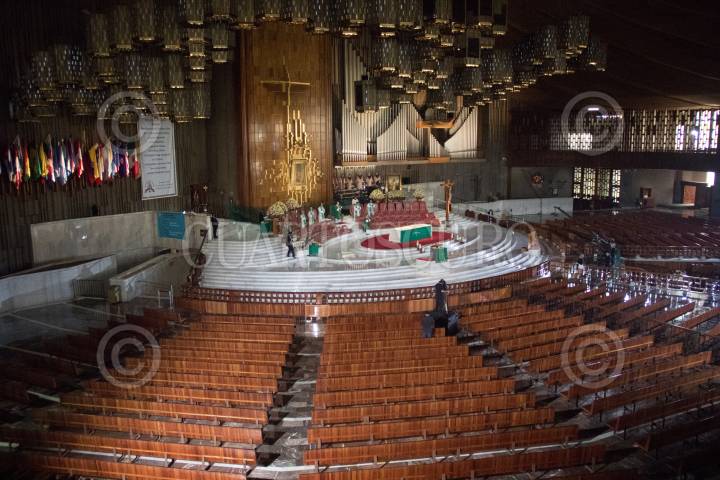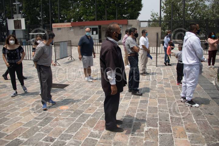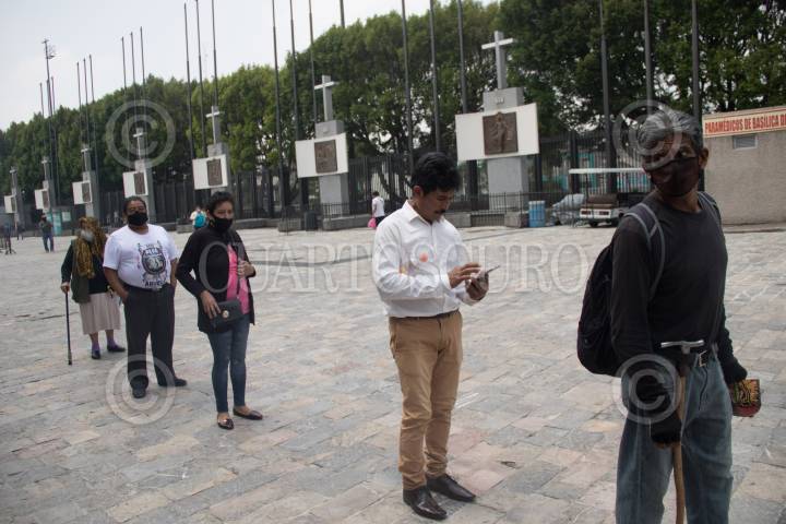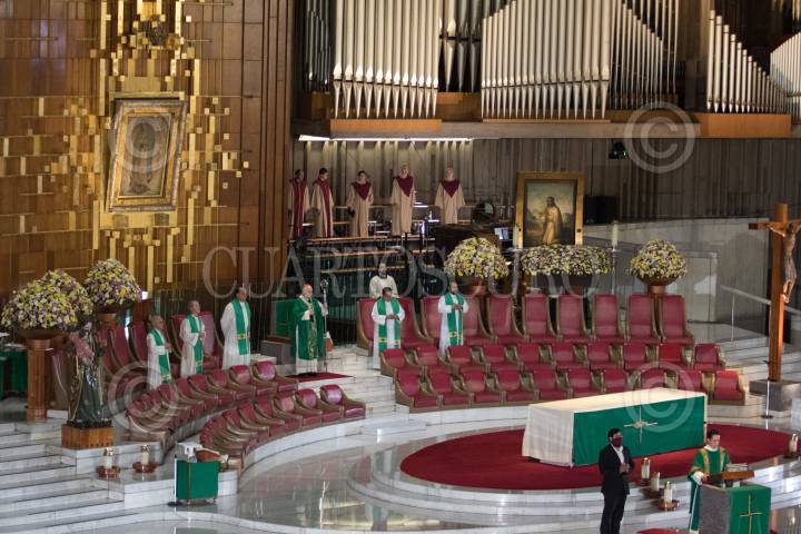 Carlos Aguiar Retes, arzobispo Primado de México, oficiando la misa dominical en la Basílica de Guadalupe. Fieles Católicos hacen fila para recibir una bendicion en el atrio Guadalupano.