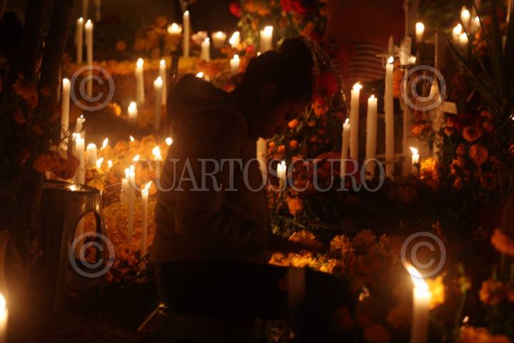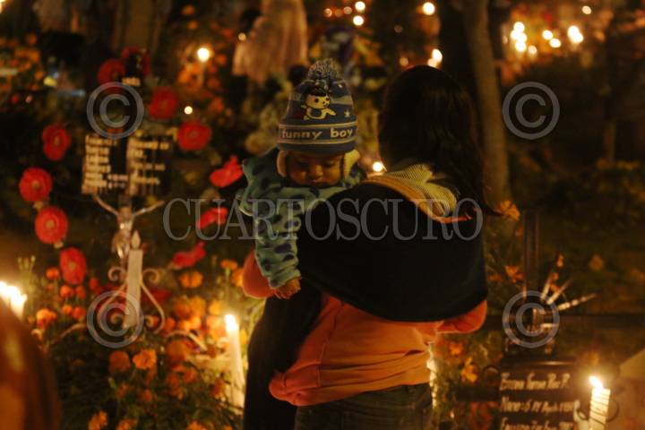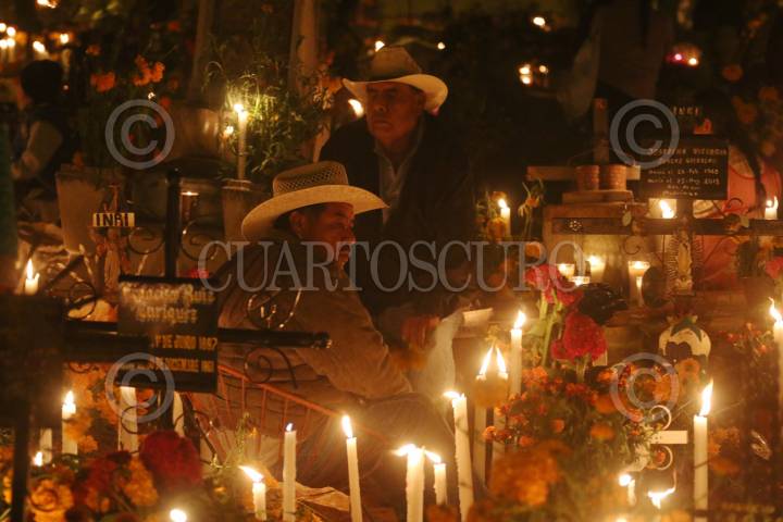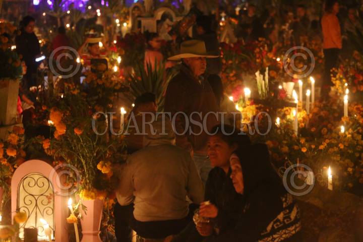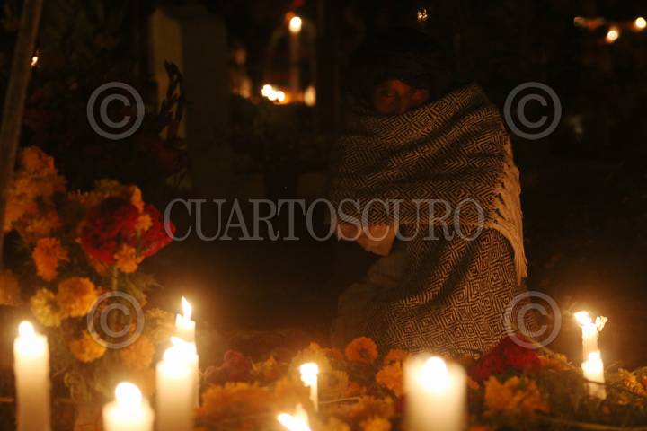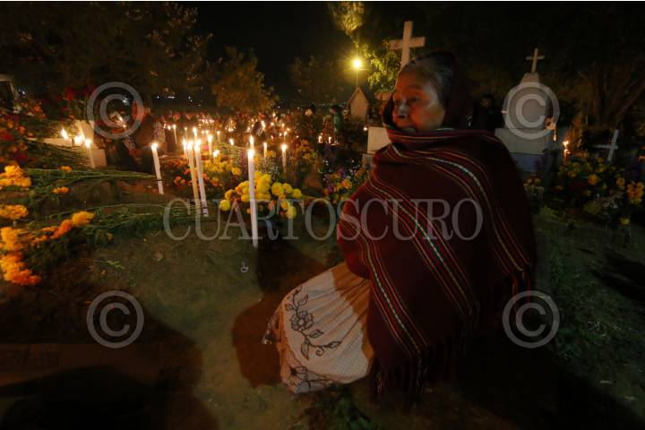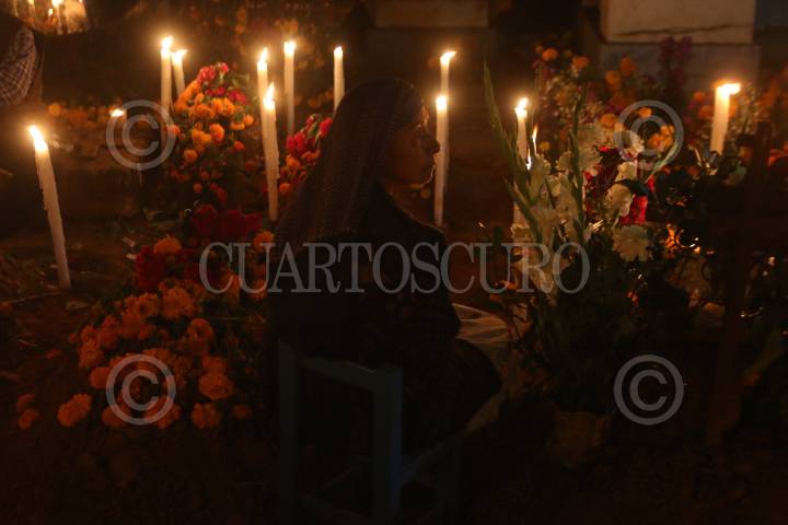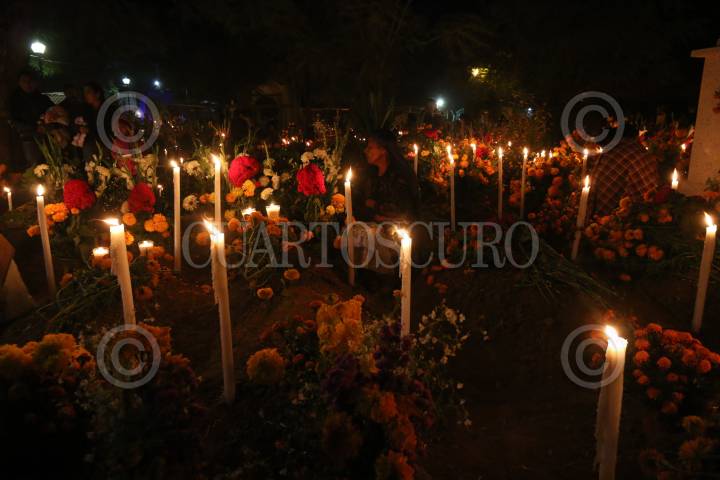 SANTA MARÍA ATZOMPA, OAXACA, 01NOVIEMBRE2017.- Habitantes de Santa María Atzompa velan a sus difuntos durante la noche del 31 de octubre y primero de noviembre, tal y como es su tradición, adornan las tumbas con flor de cempasúchil y velas para así recibir a sus familiares fallecidos. FOTO: ARTURO PÉREZ ALFONSO /CUARTOSCURO.COM