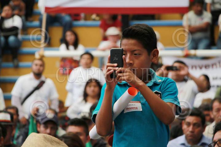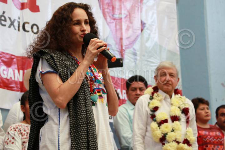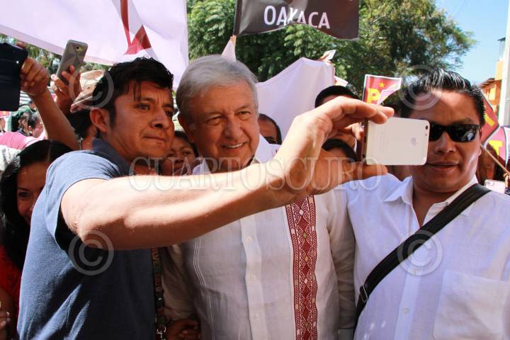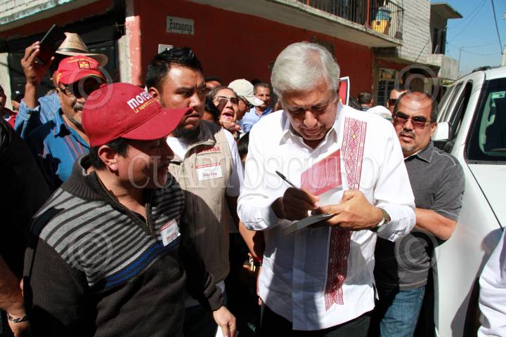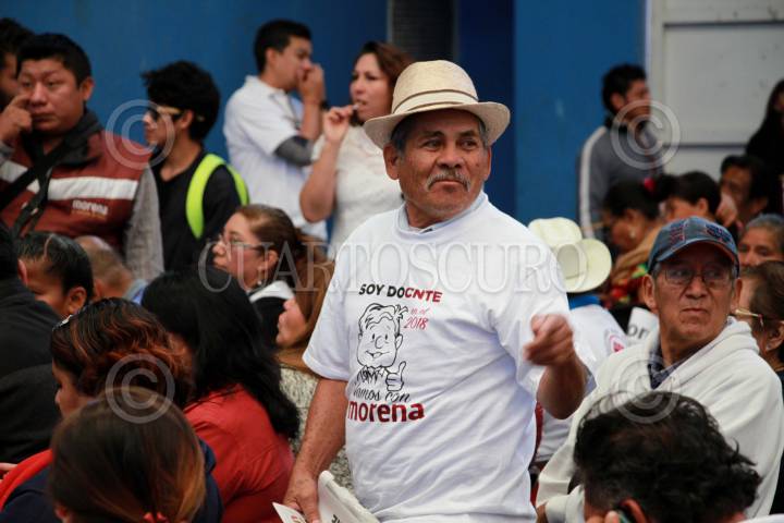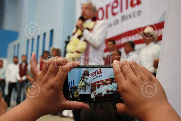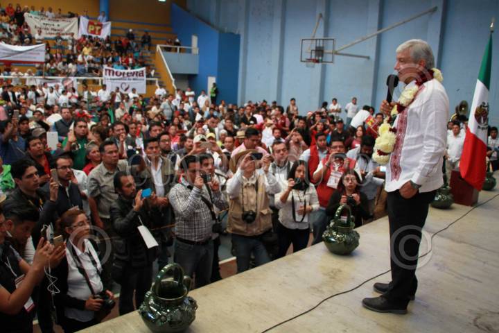 SANTA MARÍA ATZOMPA, OAXACA, 08DICIEMBRE2017.- El presidente nacional de Morena, Andrés Manuel López Obrador cerró este viernes su gira de trabajo por el estado de Oaxaca que dio inicio el pasado martes donde visitó municipios del Istmo de Tehuantepec, la Costa, Mixteca y Valles Centrales. Durante su último día López Obrador presentó a la cantante oaxaqueña Susana Harp como la coordinadora de Organización Estatal junto con Salomón Jara, esto luego de ganar una encuesta interna, afirmó el tabasqueño quien dijo la fórmula la encabezará la cantante quien meses antes había rechazado ocupar alguna candidatura por dicho partido. Asimismo el ex candidato a la presidencia afirmó que de ganar las elecciones presidenciales del 2018 las secretarías de estado ya no se concentrarán en la Ciudad de México, sino que estas se distribuirán por las diversas entidades, en específico indicó que la Secretaría de Desarrollo Social se ubicaría en Oaxaca al ser uno de los estados con mayor pobreza de todo México. FOTO: ARTURO PÉREZ ALFONSO/ CUARTOSCURO.COM