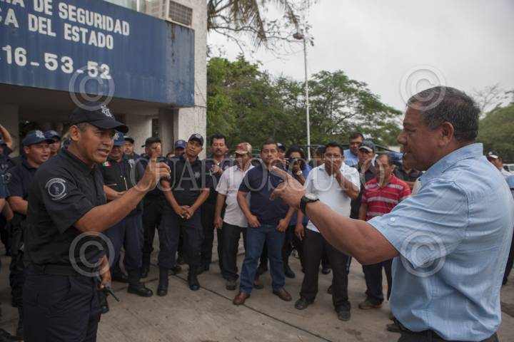 VILLAHERMOSA, TABASCO, 08ABRIL2014.- Elementos de la Policía Estatal adscritos a la Secretaría de Seguridad Pública impidieron que el general retirado Audomaro Martínez Zapata pudiera reinstalar a mandos medios de esta corporación policíaca, en donde dijeron que no recibirán ordenes de jefes inmediatos corruptos. Los sucesos de la rebelión del pelotón acontecieron en las bases operativas tres y ocho, en donde manifestaron realizarían un nuevo paro laboral si Martínez Zapata no desiste; hubo altercados y señalamientos de policías de frente al general retirado. FOTO: MARCO POLO GUZMÁN HERNÁNDEZ /CUARTOSCURO.COM