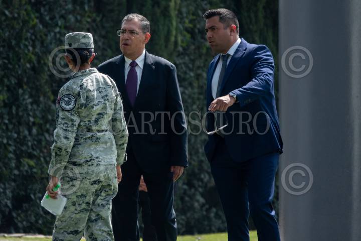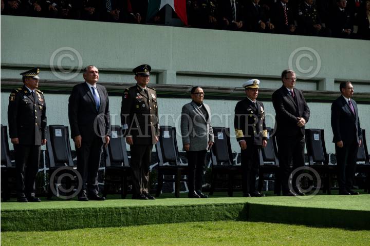 David Córdova Campos; Adán Augusto López; Luis Cresencio Sandoval, Rosa Icela Rodríguez; Rafael Ojeda y Marcelo Ebrard durante la ceremonia de toma de protesta de David Córdova Campos como comandante de la Guardia Nacional.