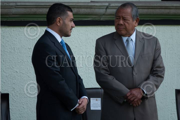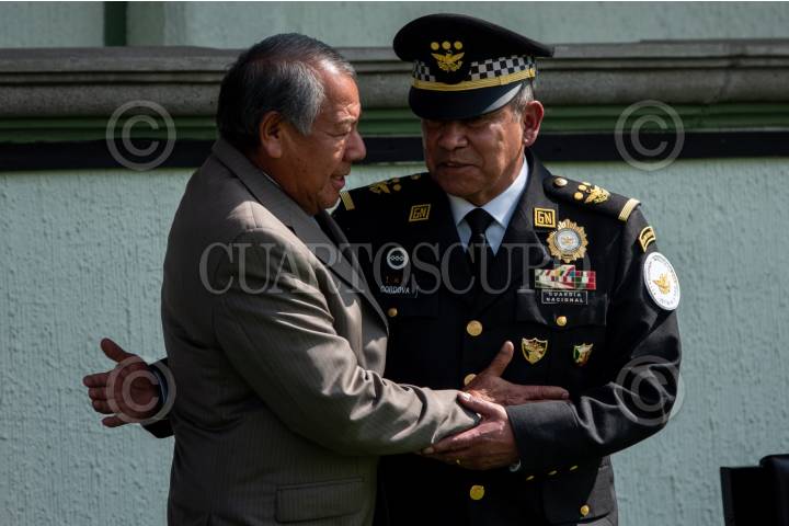 Audumaro Martínez Zapata y David Córdova Vargas durante la ceremonia dónde rindió protesta como comandante de la Guardia Nacional.