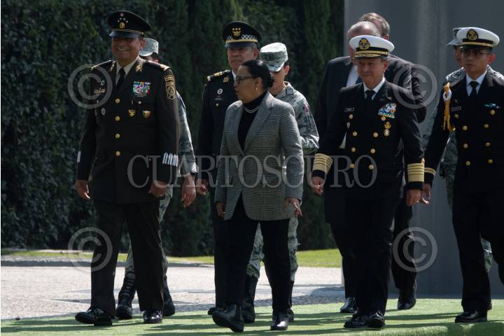 Luis Cresencio Sandoval, Rosa Icela Rodríguez y Rafael Ojeda durante la ceremonia de toma de protesta de David Córdova Campos como comandante de la Guardia Nacional.