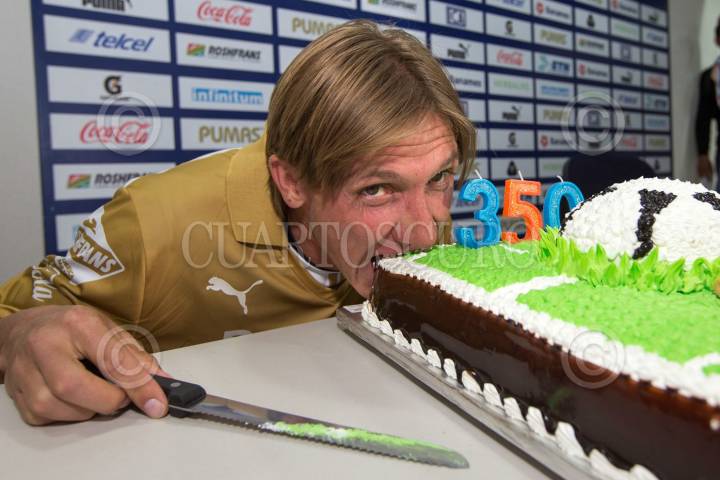MÉXICO, D.F., 30ENERO2014.- Leandro Augusto, jugador de los Pumas de la UNAM, cumplir el próximo domingo 350 partidos disputados con la camiseta de los felinos. Por ello, le dieron una playera conmemorativa y un pastel. FOTO: CUARTOSCURO.COM