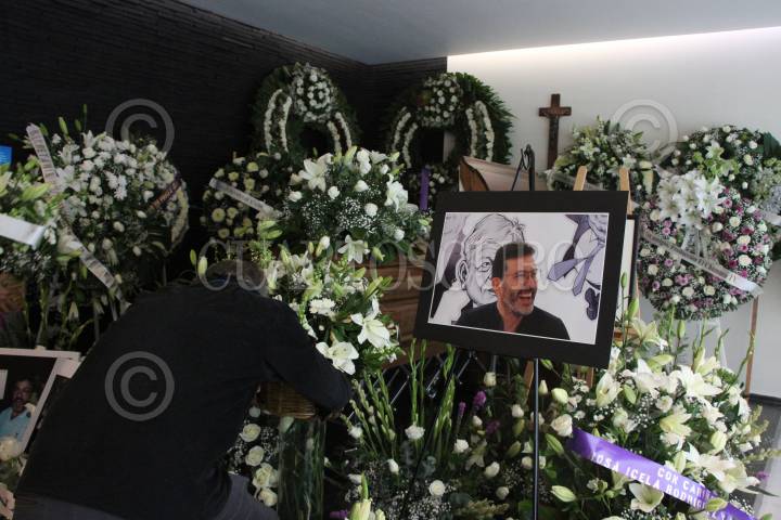 Aspectos de arreglo floral en memoria del caricaturista Antonio Helguera.