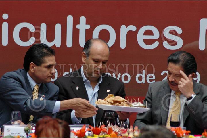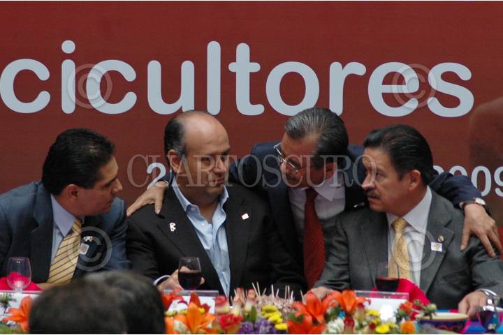 MÉXICO, D.F., 20MAYO2009.- El senador Silvano Auroles Conejo, Juan Carlos Cortes Garcia, titular de la Comisión Nacional Agropecuaria; y los senadores Heladio Ramírez y Carlos Navarrete al inicio de una comida con la Confederación de Porcicultores Mexicanos como promoción para el consumo de carne de cerdo que se realizo en el patio central de la Cámara de Diputados. FOTO: RODOLFO ANGULO/CUARTOSCURO.COM