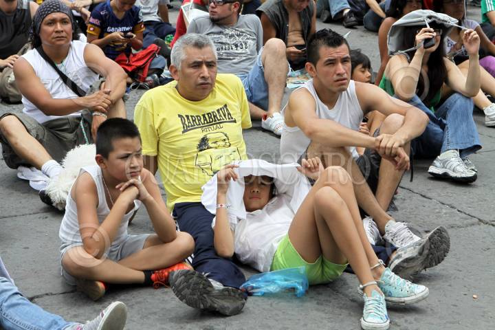 MÉXICO, D.F., 13JUNIO2010.- Aficionados acudieron a la plancha del Zócalo Capitalino en donde se encuentran las pantallas gigantes como parte del Fifa Fan Fest a ver el partido entre Alemania vs Australia del mundial Sudafrica 2010. FOTO: RODOLFO ANGULO/CUARTOSCURO.COM