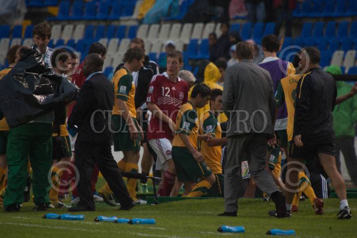 QUERÉTARO, QUERÉTARO, 20JUNIO2011.- Tras una fuerte lluvia fue suspendido en el minuto 25 del primer tiempo, el partido correspondiente al grupo E de la 14a Copa Mundial de Fútbol Sub-17, celebrado en el Estadio Corregidora cuando el equipo de Dinamarca ganaba 1-0 a su similar de Australia. FOTO: DEMIAN CHÁVEZ/CUARTOSCURO.COM