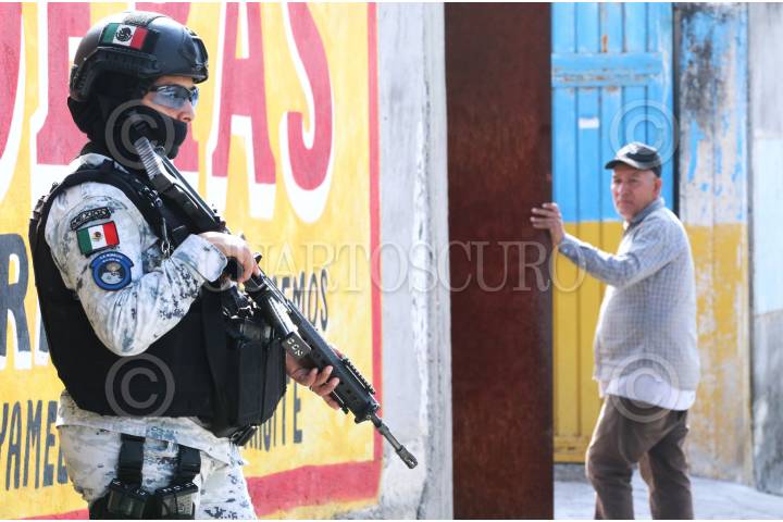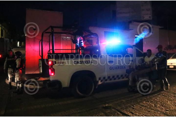 La figura a contraluz de un elemento de la Guardia Nacional en una escena de crimen donde fueron localizados los cuerpos sin vida de dos hombres en los asientos traseros de un auto en la colonia Chipitlan, al sur de la capital de Morelos