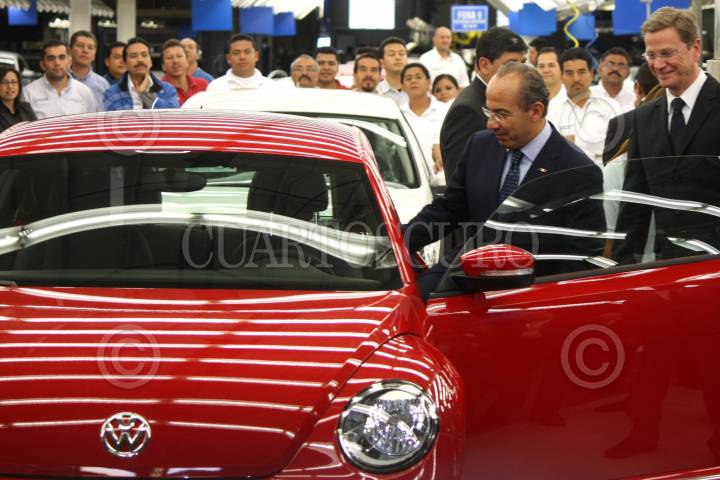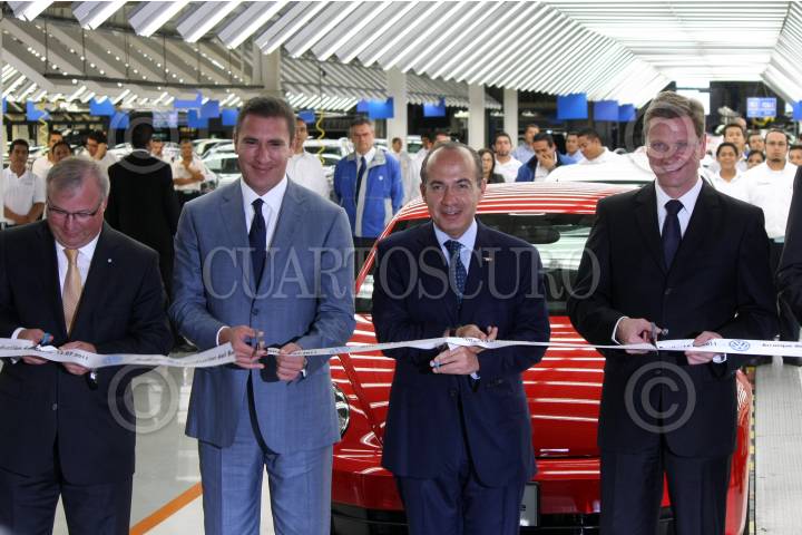 CUATLANCINGO, PUEBLA, 15JULIO2011.- Felipe Calderón Hinojosa, presidente de México, acompañado de Rafael Moreno Valle Rosas, gobernador estatal, y los directivos de la empresa automotriz Volkswagen, visitaron la planta armadora de Puebla, para dar el arranque a la producción del New Beetle. FOTO: FRANCISCO GUASCO/CUARTOSCURO.COM