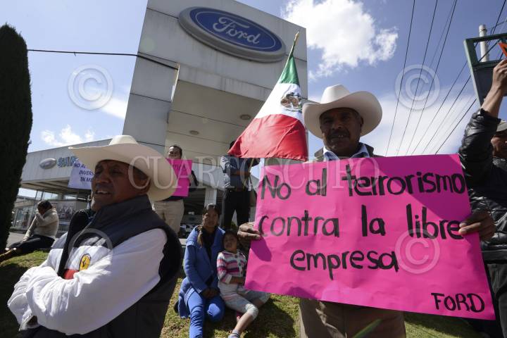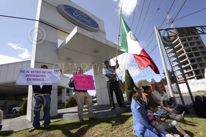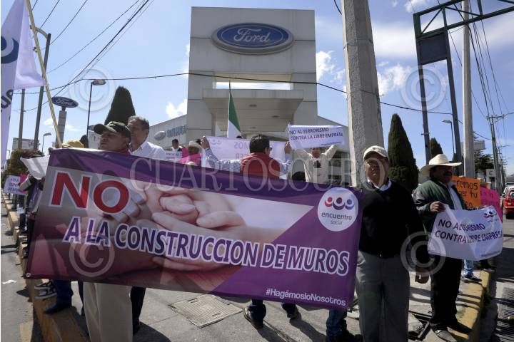 TOLUCA, ESTADO DE MÉXICO, 20ENERO2017.- Frente a las instalaciones de una concesionaria de Ford en la ciudad de Toluca se manifestaron algunos integrantes de Encuentro Social por la toma de protesta como presidente de los Estados unidos de Donald Trump, rechazando la construcción de un muro y pidiendo que no se retiren las inversiones en México. FOTO: ARTEMIO GUERRA BAZ / CUARTOSCURO.COM