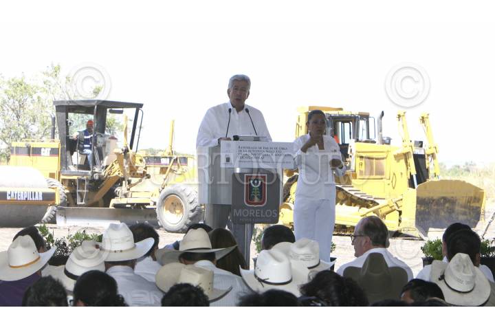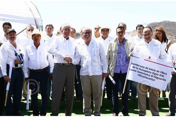 TEPALCINGO, MORELOS, 05MARZO2014.- El Secretario de Comunicaciones y Transportes, Gerardo Ruiz Esparza, y el gobernador de Morelos, Graco Ramírez Garrido Abreu, dieron el banderazo de inicio de la construcción del tramo Jantetelco-El Higuerón (Xicatlacotla), de la Autopista Siglo XXI, cuya inversión de obra es de mil 900 millones de pesos y la extensión de 62 kilómetros. En el arranque -en el kilómetro 49+300, ejido de Atotonilco, municipio de Tepalcingo, Morelos-, en el que también participaron el subsecretario de Infraestructura, Raúl Murrieta Cummings; el director general de Desarrollo Carretero, Carlos Bussey Sarmiento; alcaldes de siete municipios y 13 comisarios ejidales, el Secretario Ruiz Esparza precisó que esta obra, correspondiente al Compromiso de Gobierno 217, “es la primera nueva concesión otorgada durante la actual administración”. FOTO: CUARTOSCURO.COM