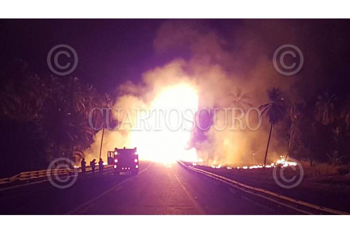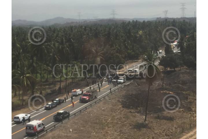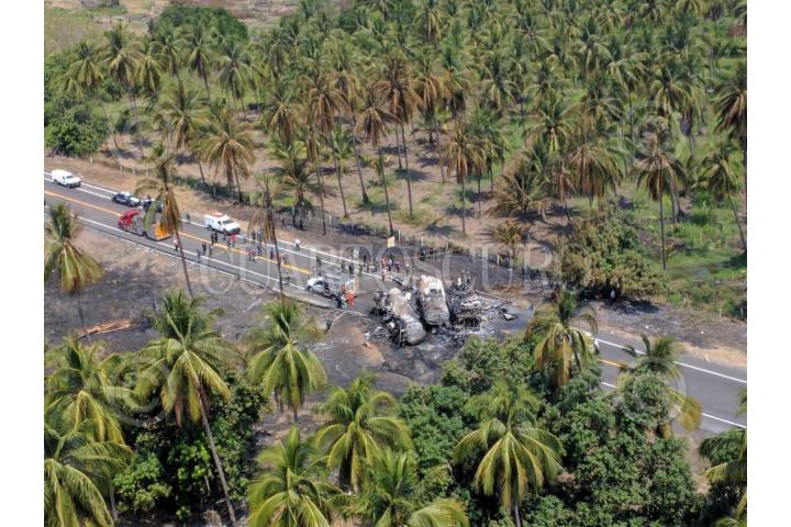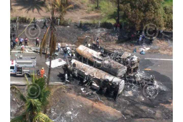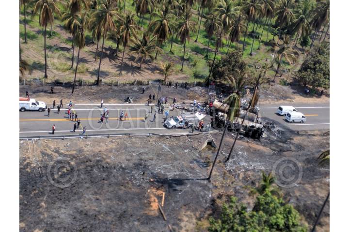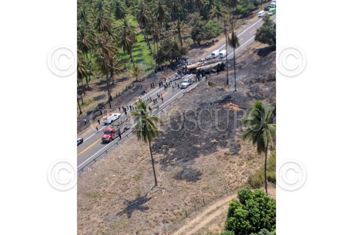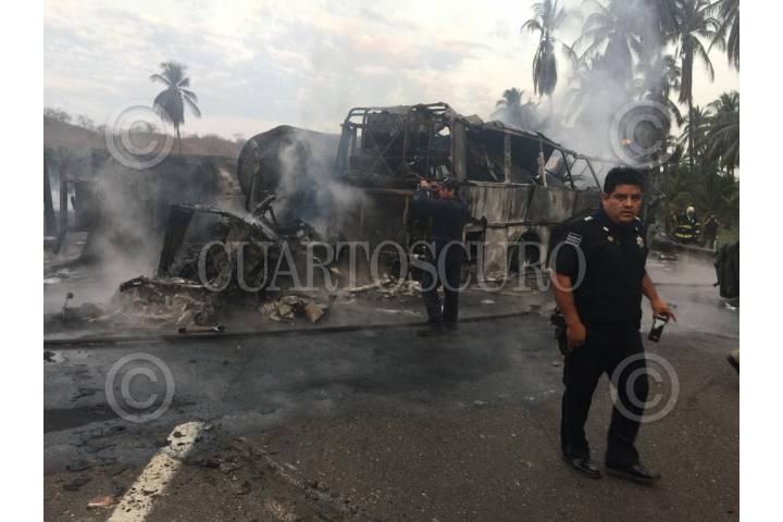 PETACALCO, GUERRERO, 13ABRIL2017.- Un pipa de gas chocó contra un autobús de turismo privado con un saldo de 28 muertos, el accidente sucedió en el kilómetro de la Autopista Siglo XXI. Autoridades reportaron que hay 9 lesionados, entre ellos dos menores de edad. El autobús se trasladaba hacia Lázaro Cárdenas en Michoacán cuando fue impactado. FOTO: ESPECIAL /CUARTOSCURO.COM